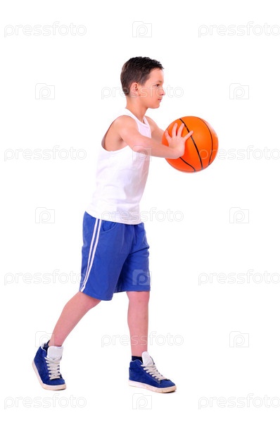 Ребенок с баскетбольным мячом, изолированный на белом фоне