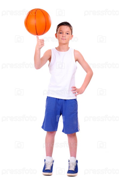 Ребенок с баскетбольным мячом, изолированный на белом фоне