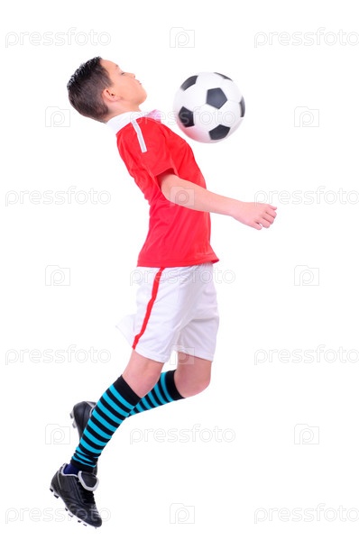 Мальчик играет в футбол на белом фоне