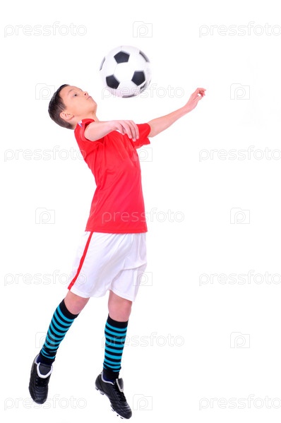 Мальчик играет в футбол на белом фоне