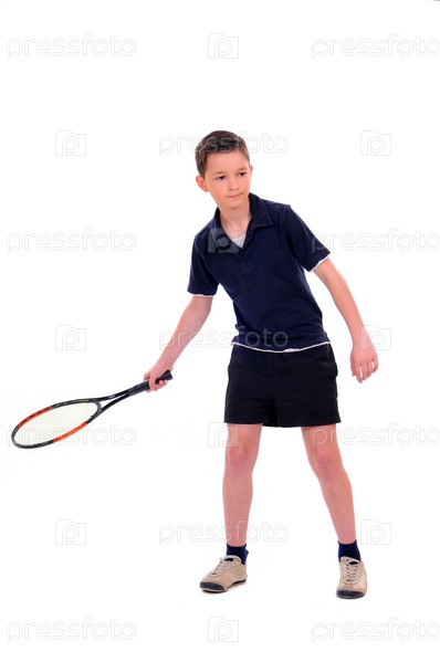 Ребенок с теннисной ракеткой, изолированный на белом