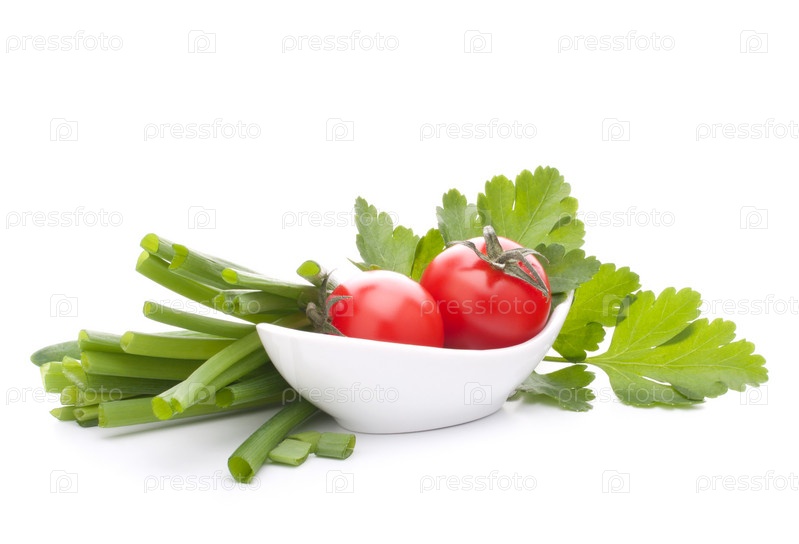Зеленый лук и помидоры черри в миске