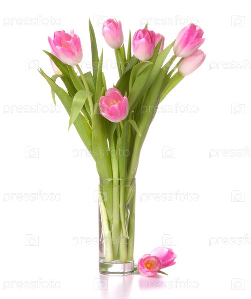 Букет розовых тюльпанов в вазе, изолированный на белом фоне