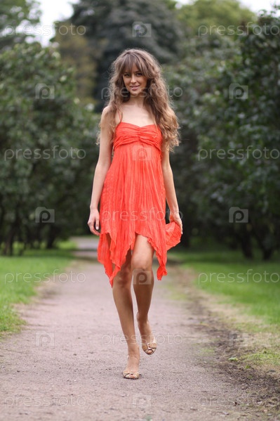 Красивая девушка в красном платье в парке