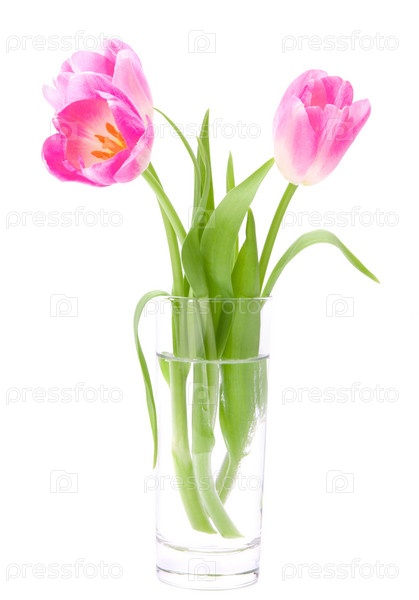 Букет розовых тюльпанов в вазе, изолированный на белом фоне