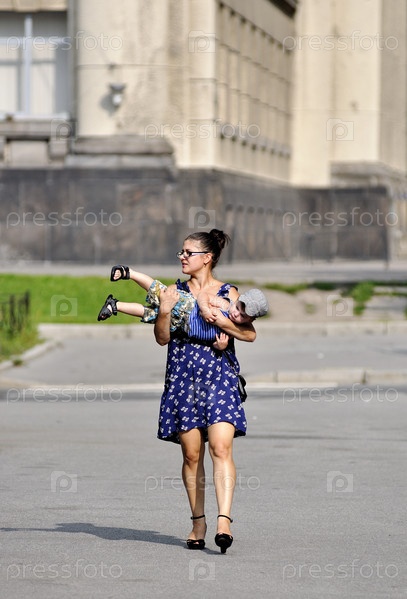Мать в платье несет сына