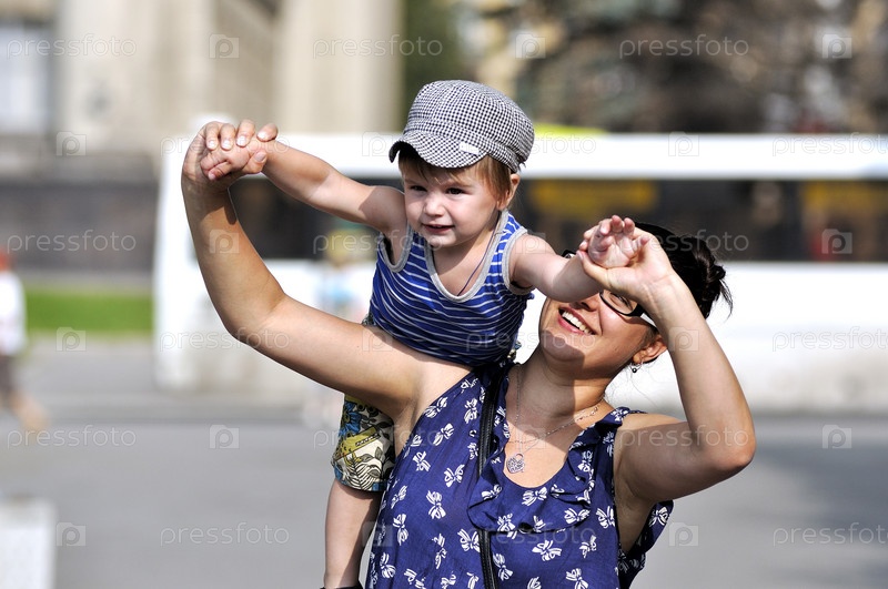 Мать в платье несет сына
