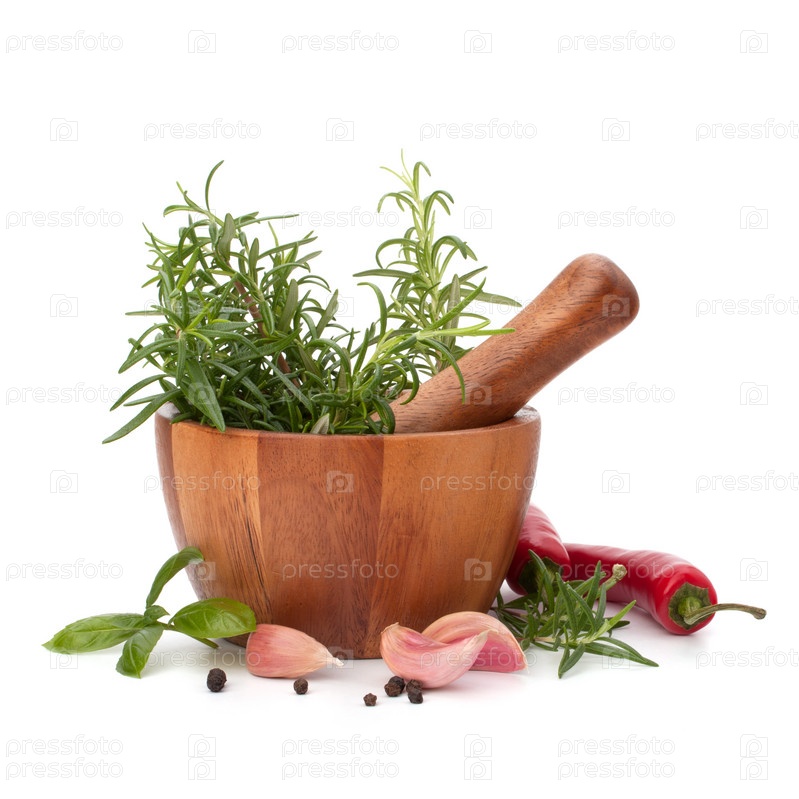Свежие травы и специи в деревянной ступке