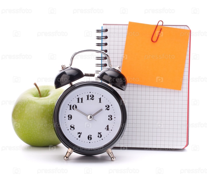 Будильник, пустой блокнот и яблоко