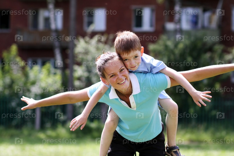 Счастливая мать с маленьким сыном играют на улице