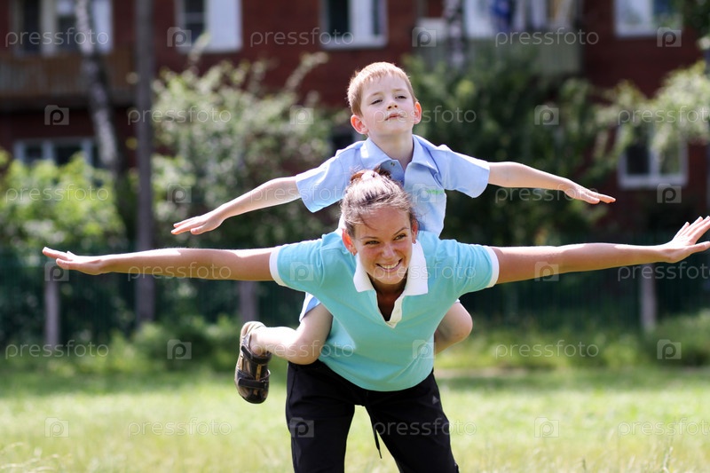 Счастливая мать с маленьким сыном весело играют на улице