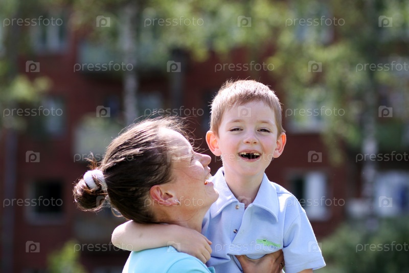 Счастливая мать держит на руках веселого маленького сына