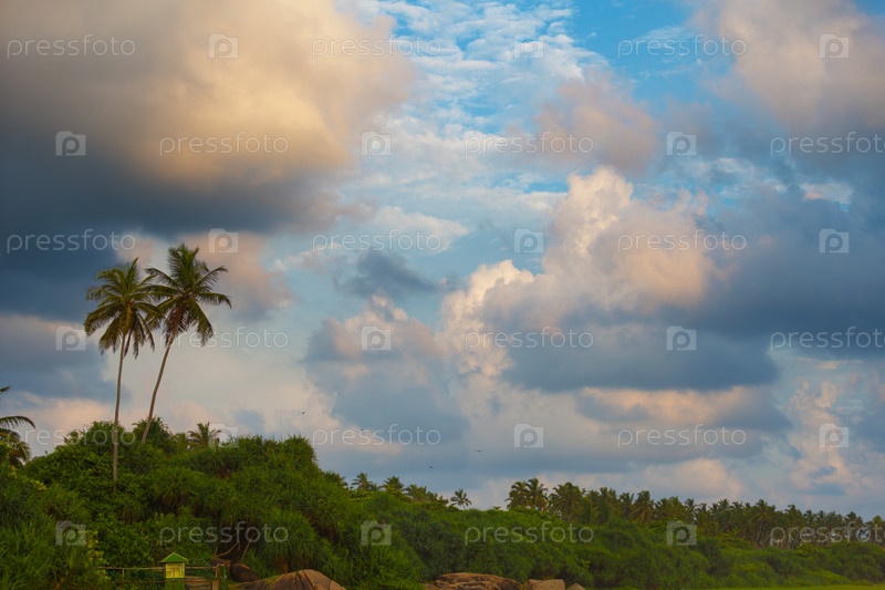 Пейзаж с тропическими деревьями и кокосовыми пальмами
