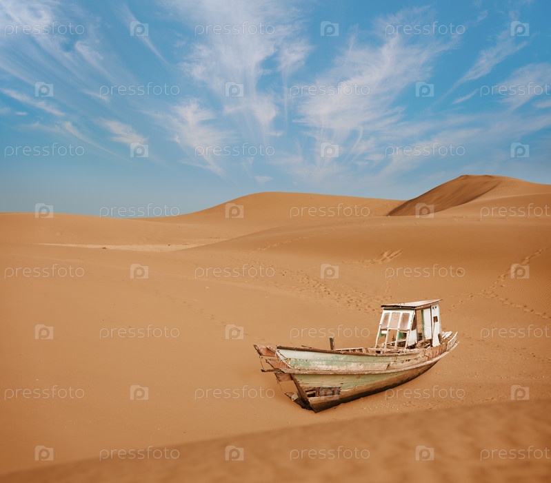 Старая лодка среди песчаных дюн в пустыне