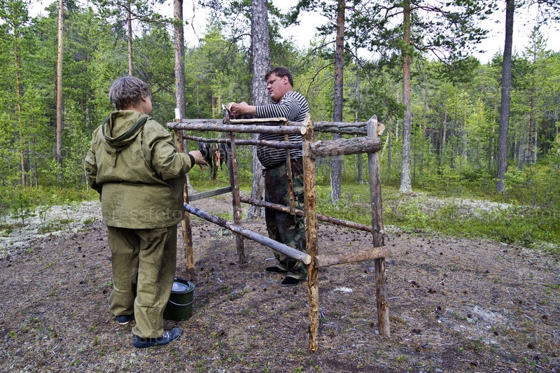 Турист и туристка развешивают рыбу для вяленья