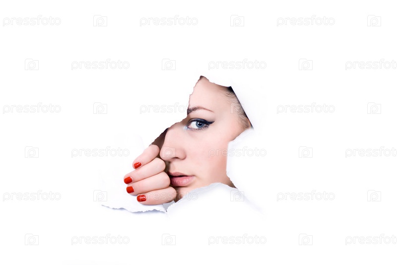 Молодая женщина смотрит через отверстие в бумаге