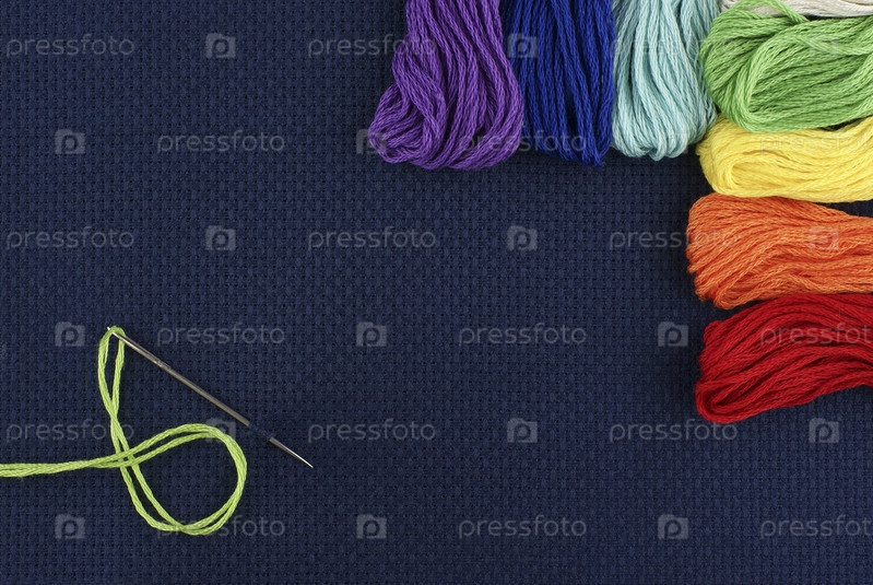 Иголка и разноцветные нитки на синей ткани