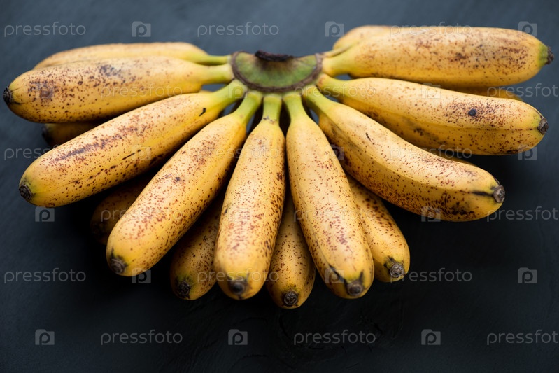Связка спелых мини-бананов на темном деревянном фоне
