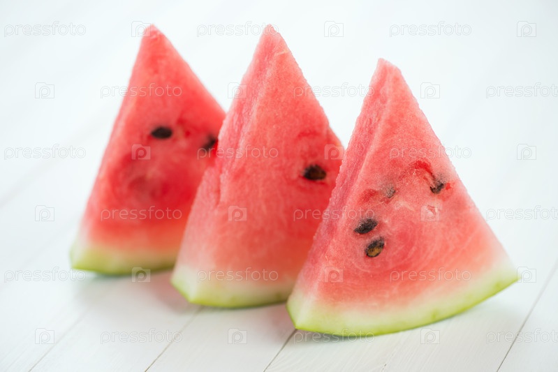 Три ломтика спелого арбуза на белых деревянных досках