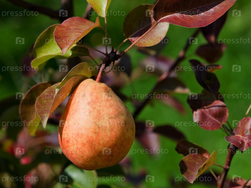 Спелая красная груша на дереве