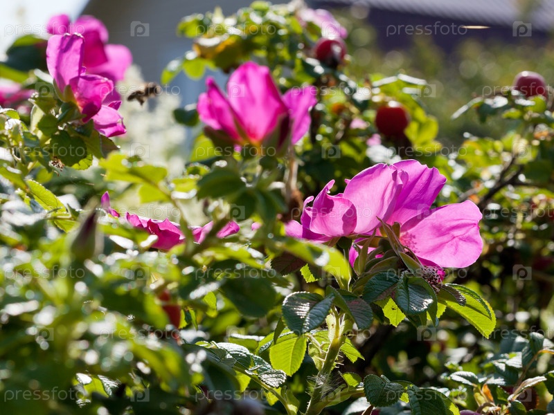 Заросли шиповника с розовым цветком