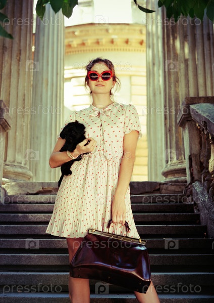 Молодая брюнетка обнимает щенка