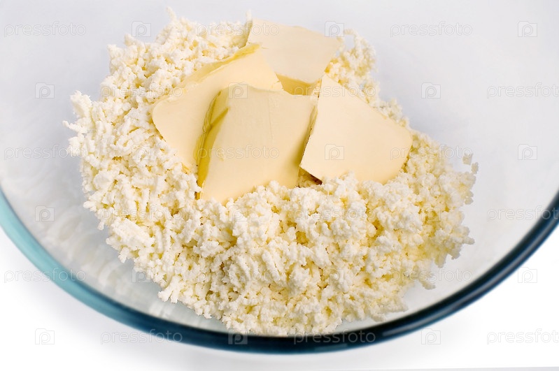 Протертый творог и кусочки масла в стеклянном блюде, изолировано на белом фоне