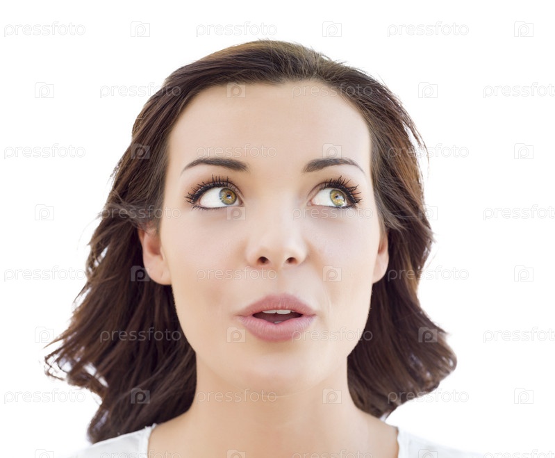 Задумчивая молодая женщина смотрит вверх на белом фоне