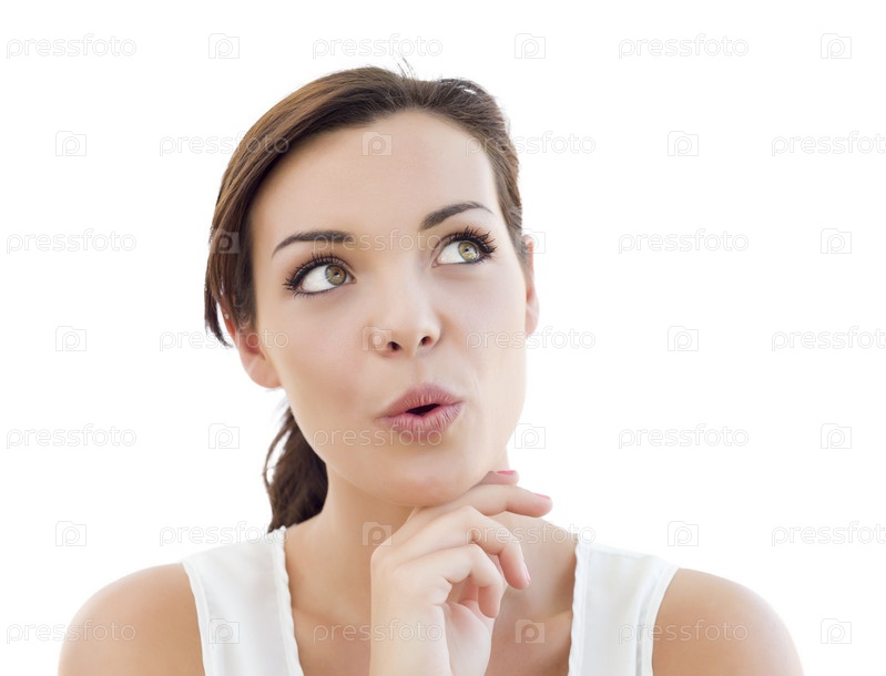 Задумчивая молодая женщина смотрит вверх на белом фоне