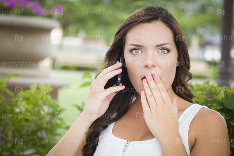 Шокированная женщина говорит по телефону на открытом воздухе