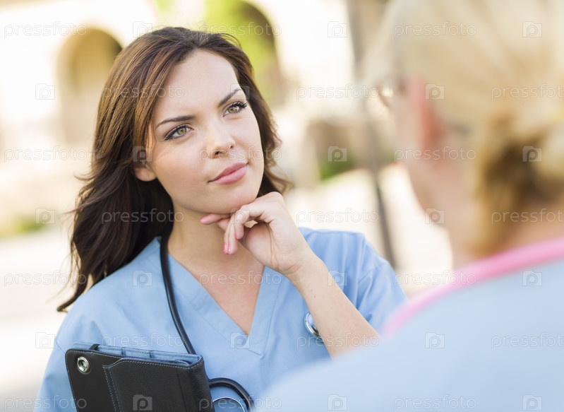 Два врача или медсестры разговаривают на улице