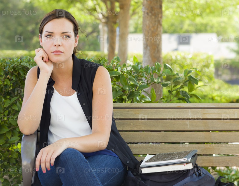 Грустная женщина сидит на скамейке рядом с книгами