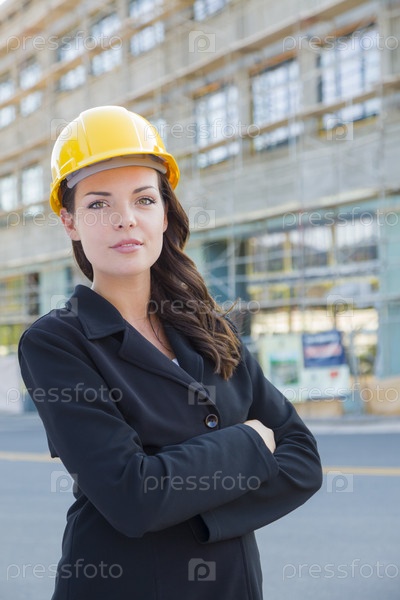 Портрет женщины подрядчика в шлеме на строительной площадке