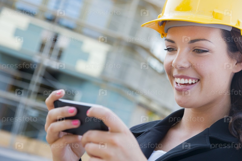 Молодая девушка подрядчик в шлеме на площадке с телефоном