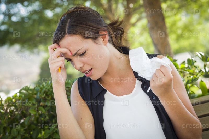 Расстроенная молодая женщина с карандашом и мятой бумагой в руках