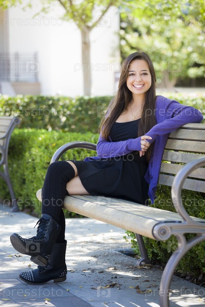Студентка на скамейке в кампусе школы