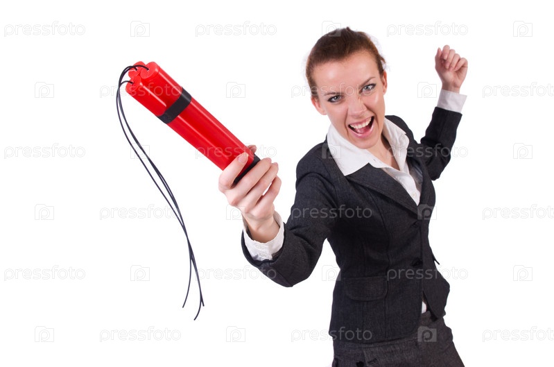 Бизнес-леди с динамитом на белом фоне