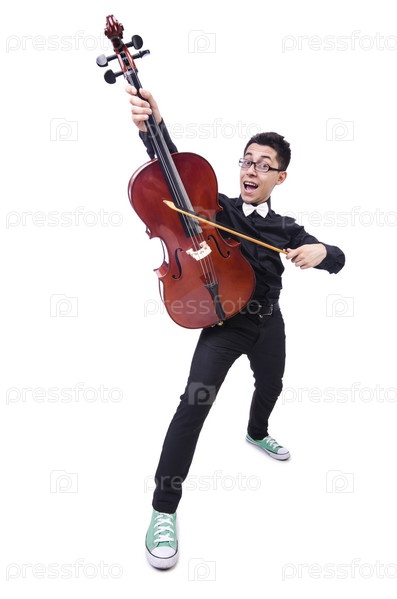 Забавный мужчина со скрипкой на белом фоне