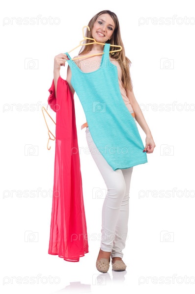 Женщина меряет новую одежду на белом фоне