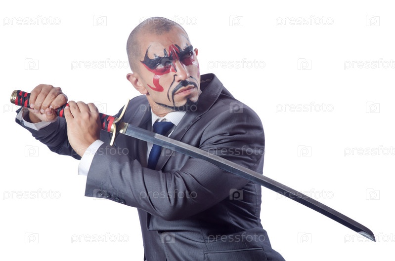 Бизнесмен с мечом, изолированный на белом фоне