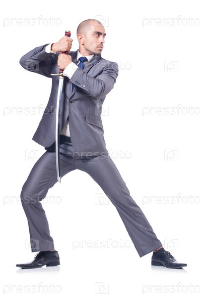Бизнесмен с мечом, изолированный на белом фоне