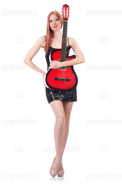 Женщина с гитарой, изолированная на белом фоне