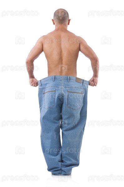 Мужчина в концепции диеты с большими джинсами