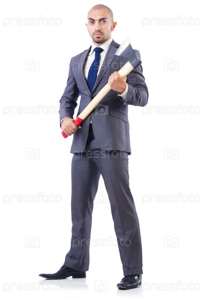 Смешной бизнесмен с топором на белом фоне