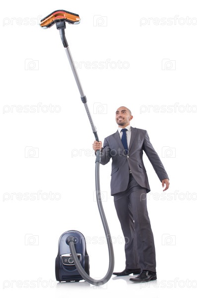 Бизнесмен с пылесосом на белом фоне