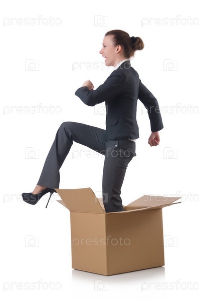 Бизнес-леди с коробкой на белом фоне