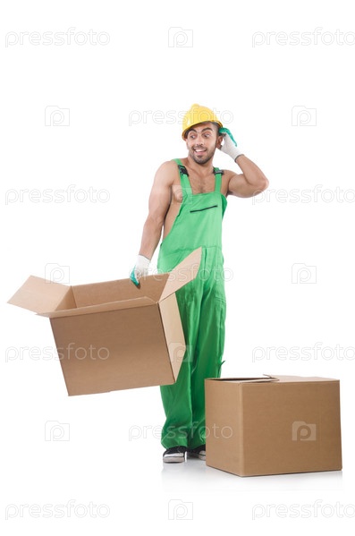 Мужчина в зеленом комбинезоне с коробками