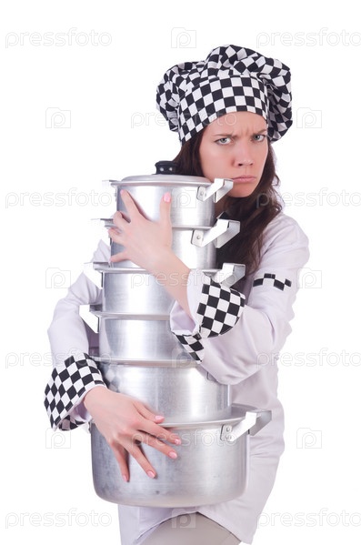 Повар с кастрюлями на белом