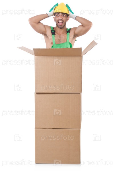 Мужчина в зеленом комбинезоне с коробками