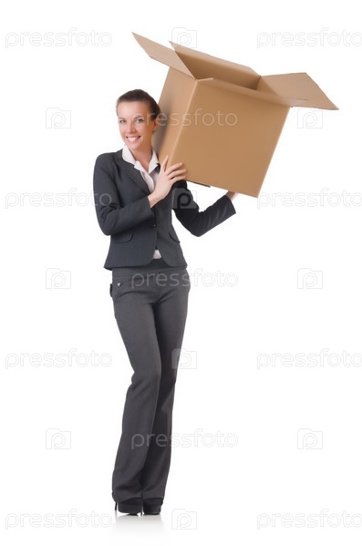 Бизнес-леди с коробкой на белом фоне